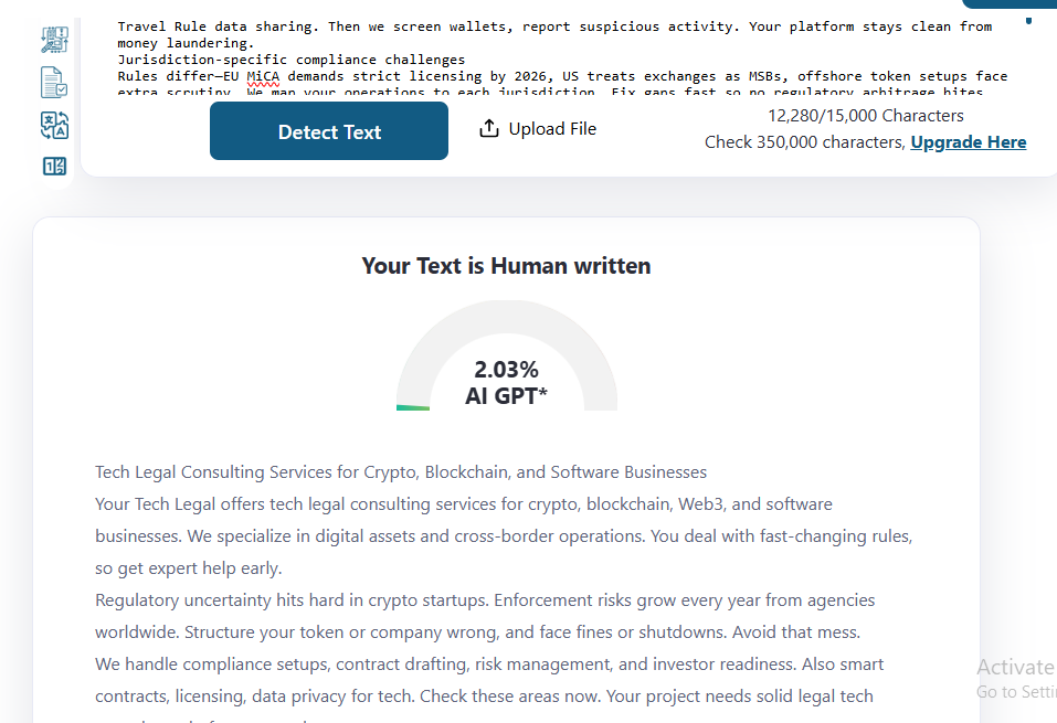 Tech legal consulting in the crypto and Web3 context means specialised advice on blockchain legal compliance, token structures, and legal structuring for crypto startups. You get help with DAOs, smart contracts, licensing in places like Dubai or Singapore, and navigating regs like MiCA or SEC rules. It's not just general IT law. It combines tech know-how with legal expertise to keep projects compliant and scalable.